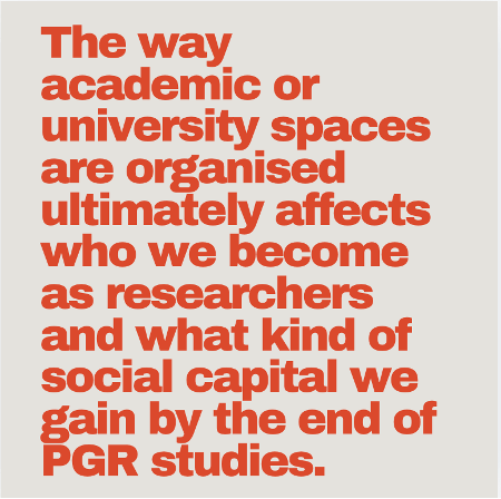 This means that the way academic or university spaces are organised ultimately affects who we become as researchers and the social capital we gain by the end of our PGR studies. In this scenario, the arrangement of physical spaces may facilitate (or impede) our interactions with others.